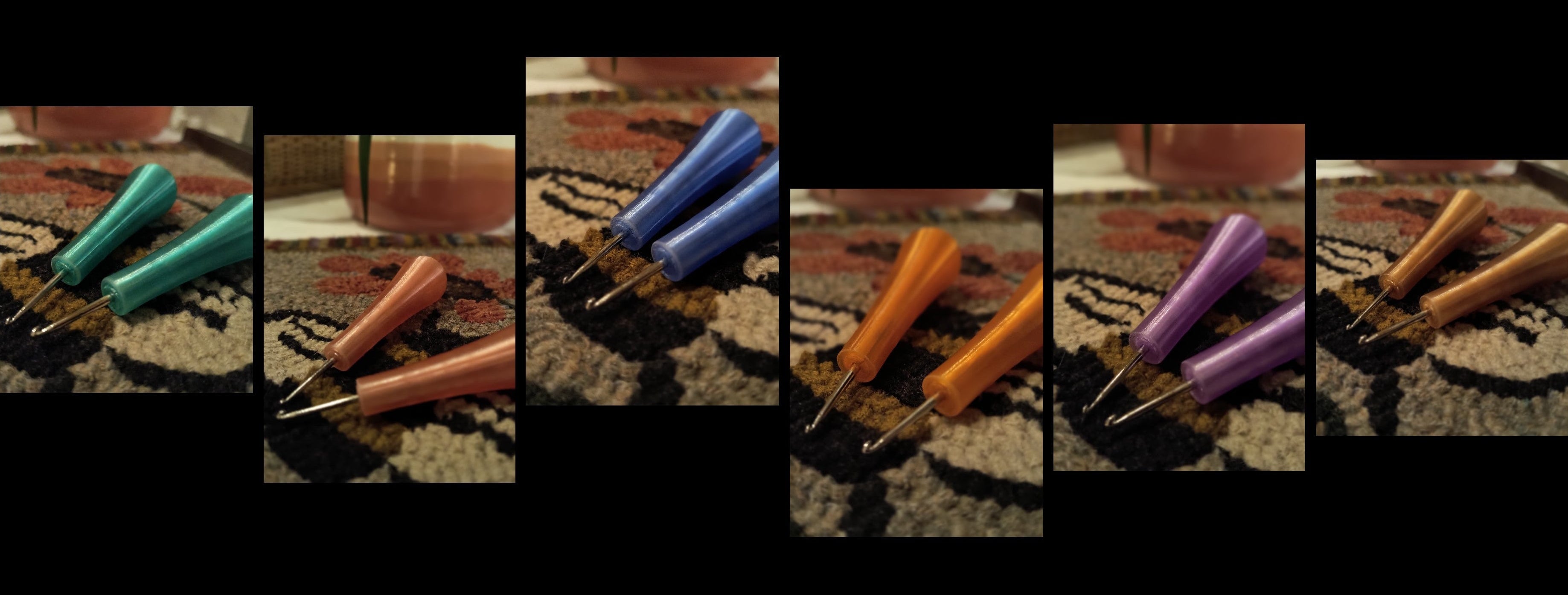 Rug Hooks designed & made by Erin & her husband, Scott, for our shop. The combination of stainless steel hooks & high quality, durable plastic for the handles using Scotts thoughtful design ensures longevity & comfort. These have been tested by many hookers, who have all loved them! They are offered in a variety of fun colors, which will make it easy to find in your craft bag when it's time to get hooking! Please contact us for Wholesale.