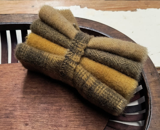 Our Hand Dyed Wools all start out as 1/2 yard pieces, which are dyed in small batches right in our shop using all of our own original recipes. This means the mottling will vary from piece to piece, but the tones will remain the same.