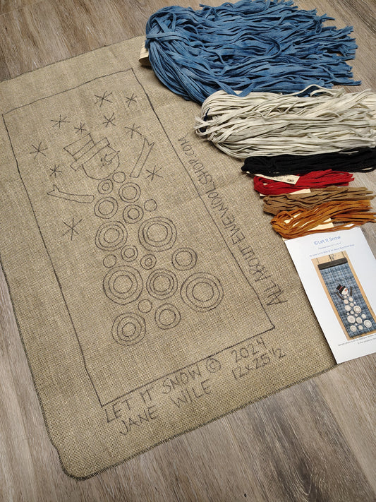 Our kits all use Hand Dyed Wool Fabric or Wool Yarn from Briggs & Little that we hand dyed right here in our shop. We also use high quality Linen for all of our patterns which accommodates our 2 & 3 Ply Wool Yarn & Wool Fabric Strip Sizes 3 to 12 - we even use 1/2" ripped strips with it perfectly, too!