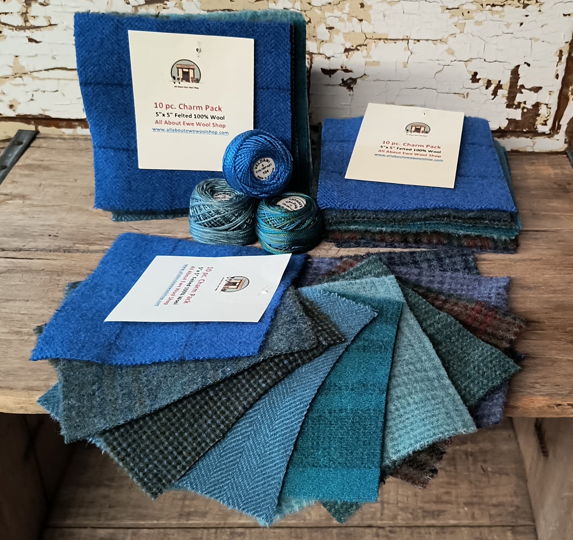 We've got our Charm Packs available with a beautiful variety of color choices! These are all new & felted 100% wools. There are 10 pieces in each pack, each piece is approx 5"x5"