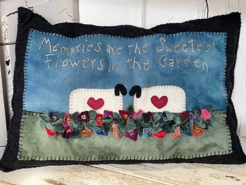 Sweet Memories has always been a special design for us - we love the little phrase stitched on the front, how very true it is! You can stuff it as a pillow, as we did, or leave it as a wall hanging/framed piece or mat. Many options!